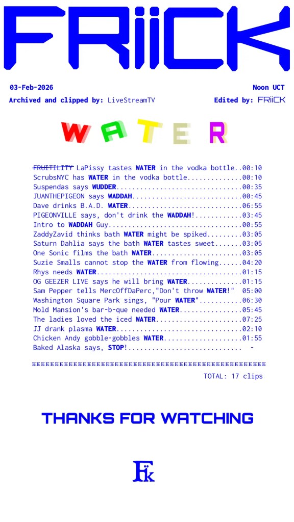 Below, is a “receipt” for this edit “What’s Smelling in IRL Livestreaming?” It lists all the live-streamers featured (did I miss anyone?) and the times listed on the right are timestamps when they appear in the edit.
